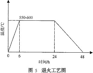 殘余應(yīng)力會(huì)引起鋼件在使用一定時(shí)間以后,或在隨后的切削加工中產(chǎn)生變形或裂紋。耳軸退火主要用來(lái)消除堆焊造成的殘余應(yīng)力、細(xì)化金相組織。采用局部退火裝置:制作一鋼筒,鋼筒內(nèi)、外襯石棉,內(nèi)盤電熱絲;鋼筒一端開口,套在耳軸上開口部與包體焊接固定;退火時(shí)鋼筒四周覆石棉,鋼包內(nèi)耳軸位置覆石棉;對(duì)每只鐵水罐退火過(guò)程嚴(yán)格按照?qǐng)D5所示溫度曲線要求。