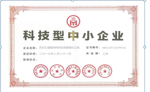 新材料科技公司于2016年11月啟動“科技型中小企業”認定工作,日前已通過綿陽市科學技術和知識產權局、綿陽市財政局、綿陽市工商行政管理局、綿陽市經濟和信息化委員會以及中國人民銀行綿陽市中心支行聯合認定,獲得了“科技型中小企業”稱號 。