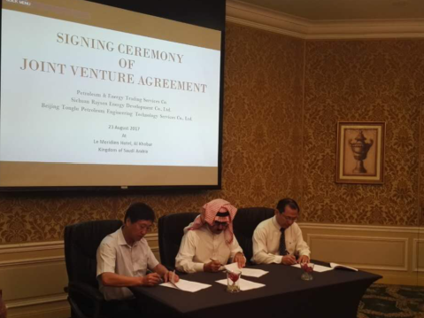 沙特是名副其實的“石油王國”,其石油儲量位列世界三甲,其產量則居世界首位,其金融體系完善發達,財稅政策極具競爭力,稅收便易度方面排名世界第三位。在“2030愿景”政策大背景下,沙特政府鼓勵當地化生產和服務,以減少國家經濟對石油出口的依賴,同時為快速增長的人口提供更多的就業機會。為抓住沙特政府經濟改革的歷史性機遇,在前期充分調研和磋商的基礎上,我司總裁助理方清先生、沙特Petroleum and Energy Trading Services Est. 公司總裁ADEL先生和北京同路石油工程技術服務公司總裁袁繼存先生一致同意:三方決定在沙特阿拉伯王國成立合資公司,從事油田技術服務、產品生產、國際貿易等業務,共同開拓沙特及中東地區市場,并于2017年8月23日(沙特當地時間)在沙特阿拉伯王國庫巴市LE MERIDIEN 大酒店簽署了合資協議。